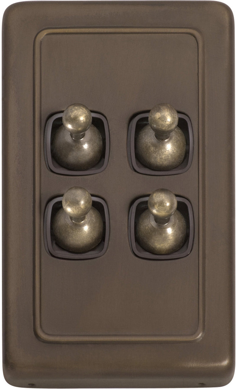 Flat plate 4 gang toggle switches with brass covers and HPM mechanisms. Matching sockets and compatible accessories also available.