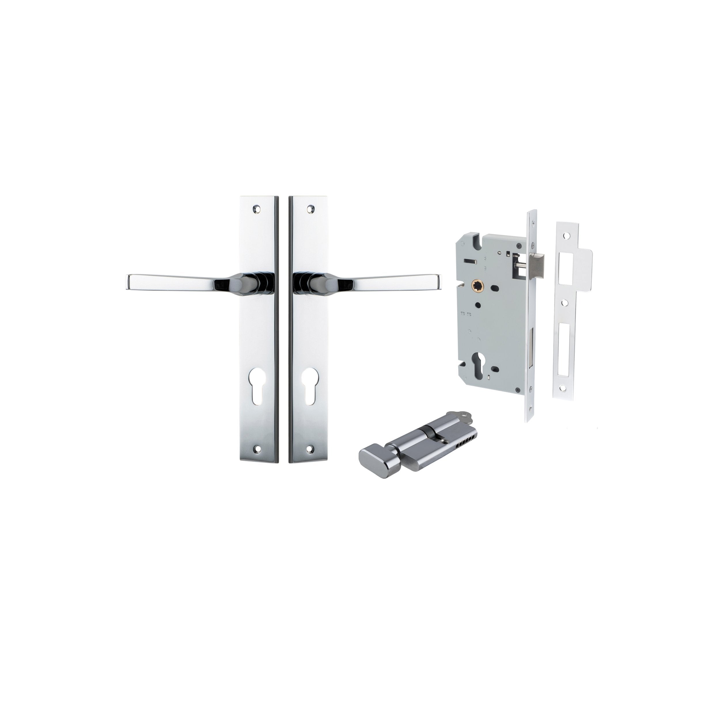 Kit Content: 2 x Levers / Knobs on Backplates of your choice 1 x Euro Mortice Lock CTC85mm Backset 60mm 1 x Face Plate 1 x Striker Plate 1 x Euro Cylinder 5 Pin Dual Function or Key / Thumb 2 x Keys 1 x Standard Spindle 2 x Sprung Spindles 2 x Tie Bolts 18 x Screws 1 x Dust Box 1 x Drill Template 1 x Instruction Manual