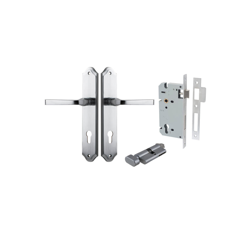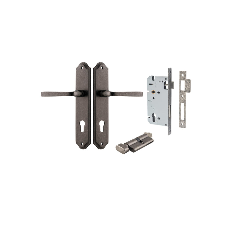 Kit Content: 2 x Levers / Knobs on Backplates of your choice 1 x Euro Mortice Lock CTC85mm Backset 60mm 1 x Face Plate 1 x Striker Plate 1 x Euro Cylinder 5 Pin Dual Function or Key / Thumb 2 x Keys 1 x Standard Spindle 2 x Sprung Spindles 2 x Tie Bolts 18 x Screws 1 x Dust Box 1 x Drill Template 1 x Instruction Manual