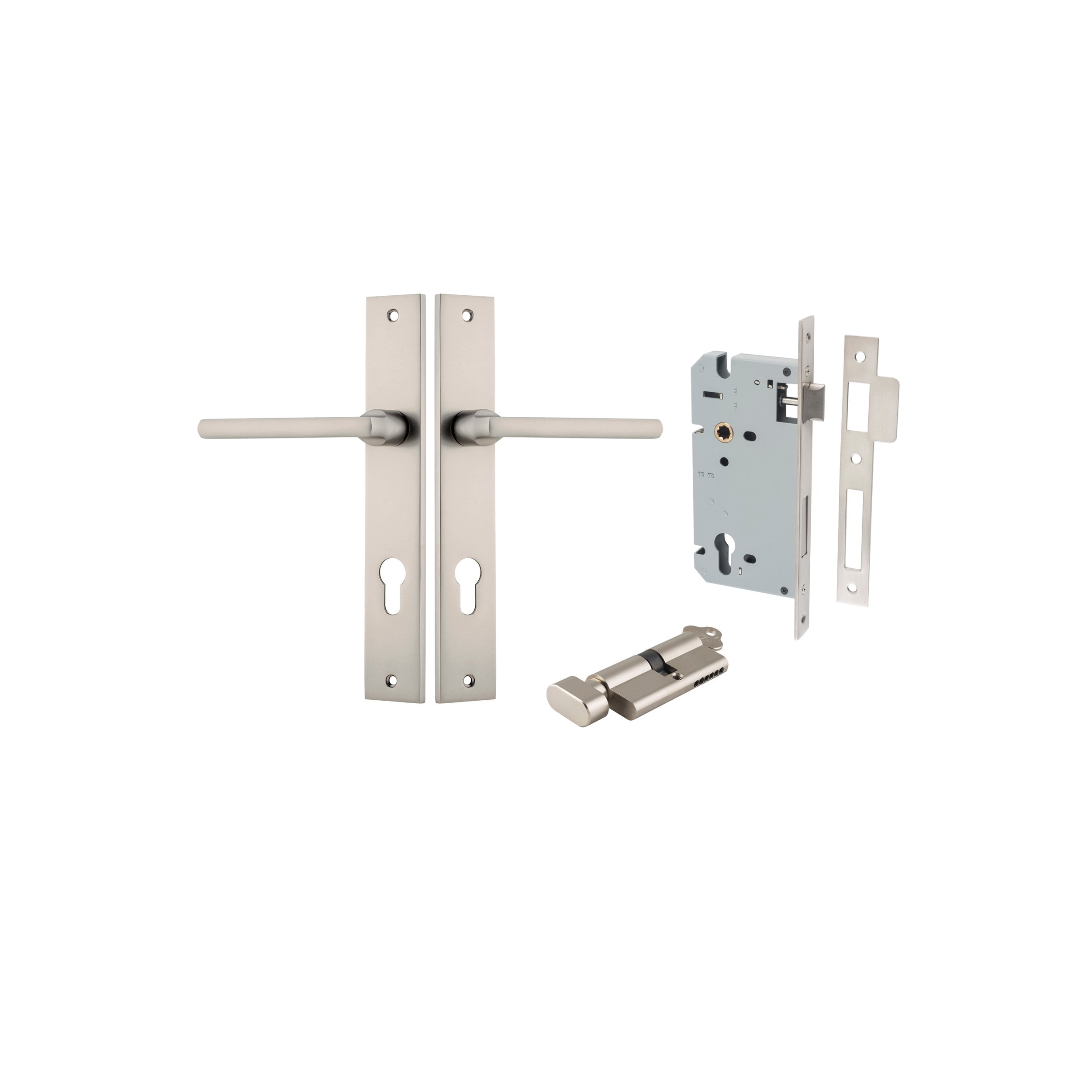 Kit Content: 2 x Levers / Knobs on Backplates of your choice 1 x Euro Mortice Lock CTC85mm Backset 60mm 1 x Face Plate 1 x Striker Plate 1 x Euro Cylinder 5 Pin Dual Function or Key / Thumb 2 x Keys 1 x Standard Spindle 2 x Sprung Spindles 2 x Tie Bolts 18 x Screws 1 x Dust Box 1 x Drill Template 1 x Instruction Manual