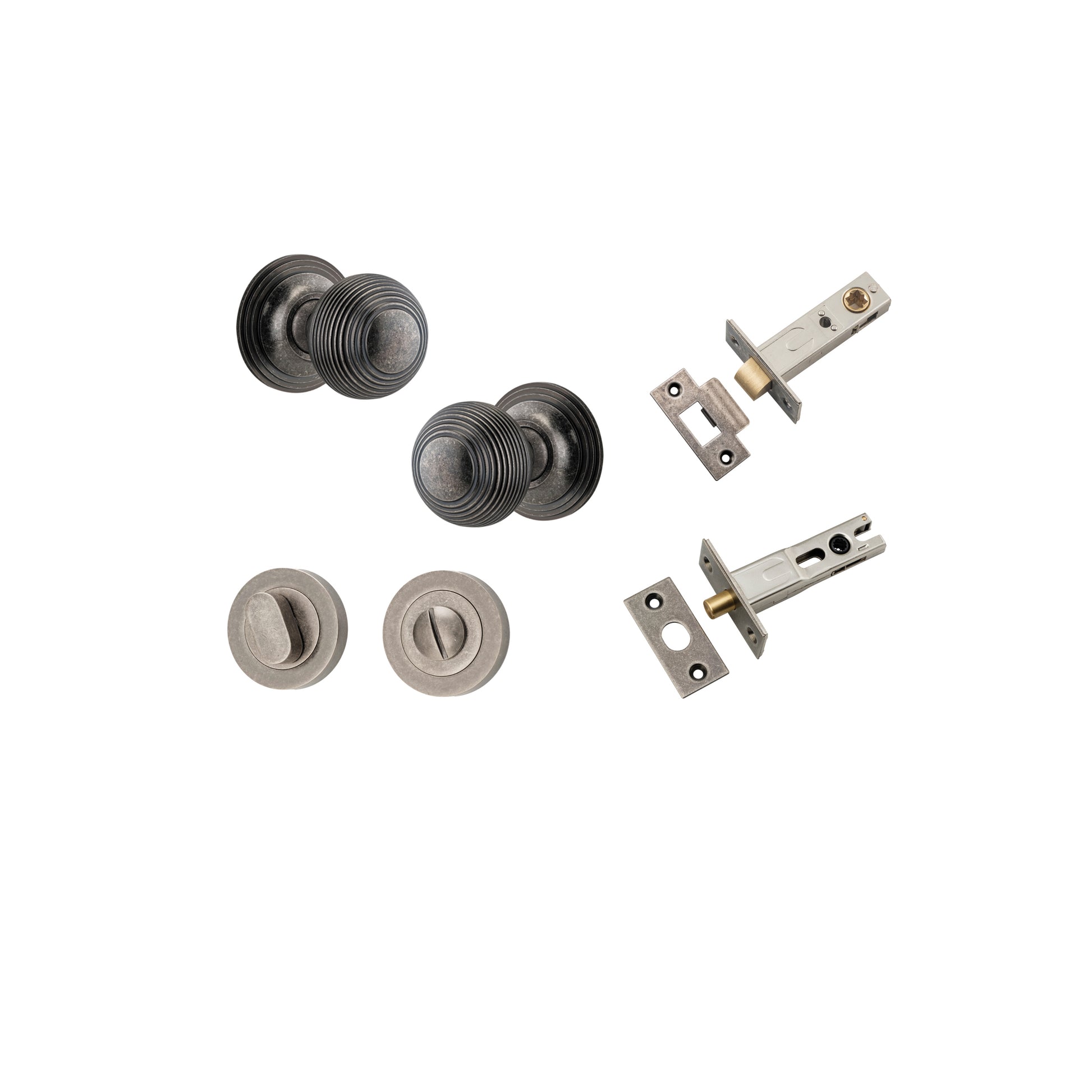 Kit Content: 2 x Levers on Round / Square Roses of your choice 1 x Tube Latch Split Cam Backset 60mm 1 x Face Plate 1 x Striker Plate 1 x Privacy Turn Oval Concealed Fix Round / Square 1 x Privacy Bolt Round Backset 60mm 1 x Standard Spindle 2 x Sprung Spindles 2 x Privacy Spindles 39 x Screws 2 x Dust Boxes 2 x Allen Keys* 4 x Grub Screws* 1 x Drill Template 1 x Instruction Manual *With Square Rose only